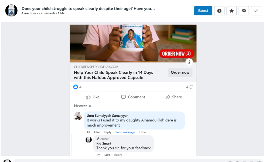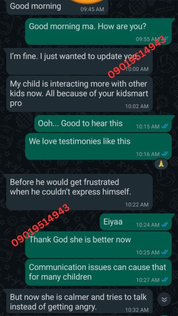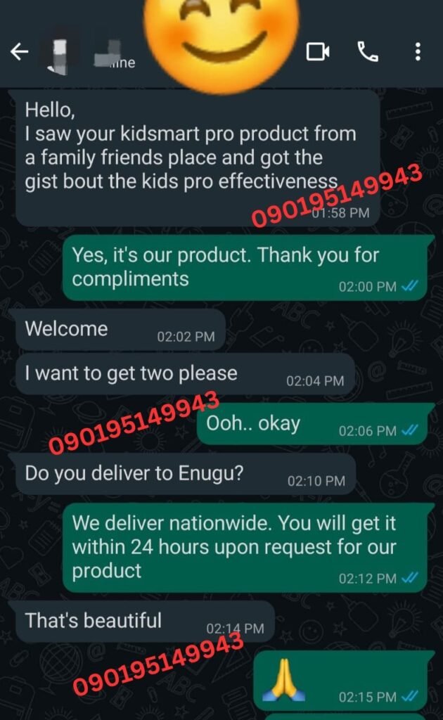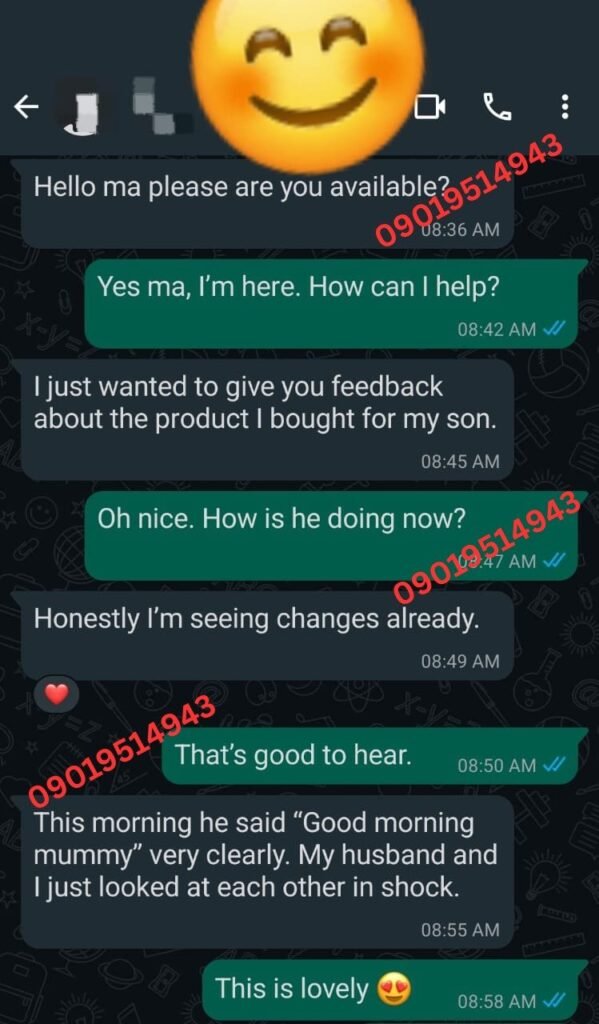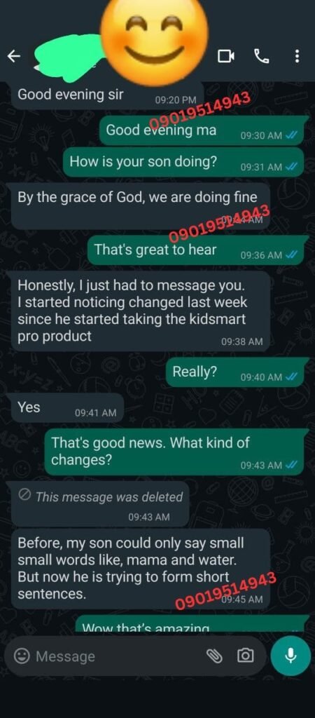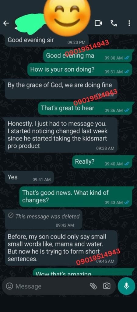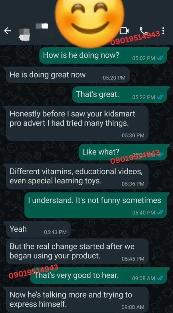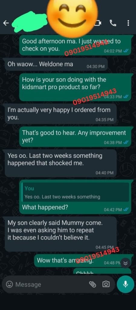 I spent over ₦120,000 on therapy and different syrups — no real improvement. By the third week of using KidSmart Pro, he started forming clearer words. By the second month, he was calling his sister by name clearly. I cried the first time he said ‘Mummy I want water.’ This product gave me back my peace.”